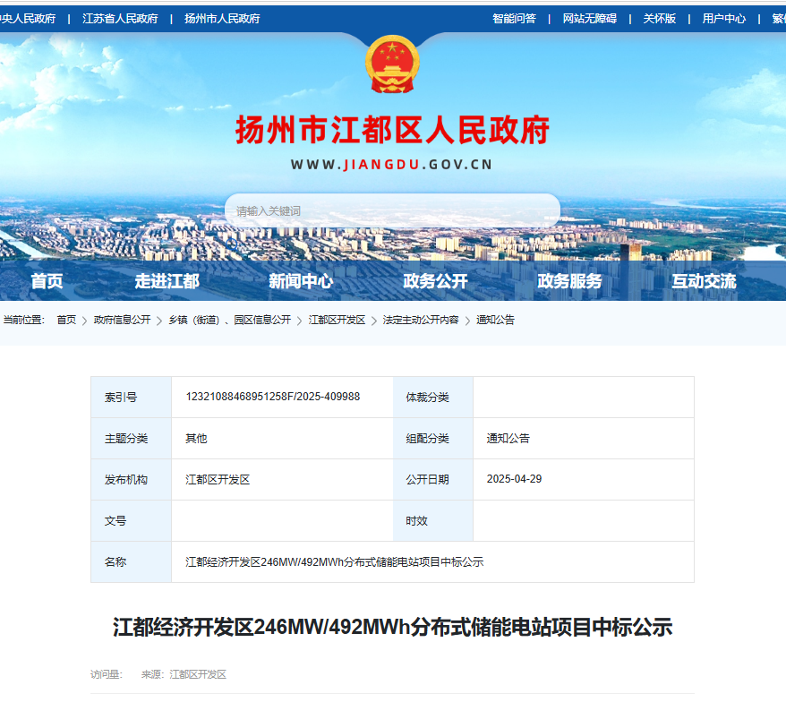 储能与电力市场获悉,4月29日,江都经济开发区246MW/492MWh分布式储能电站项目中标公示。江苏威达建设集团有限公司59000万元,折合单价1.199元/Wh中标。